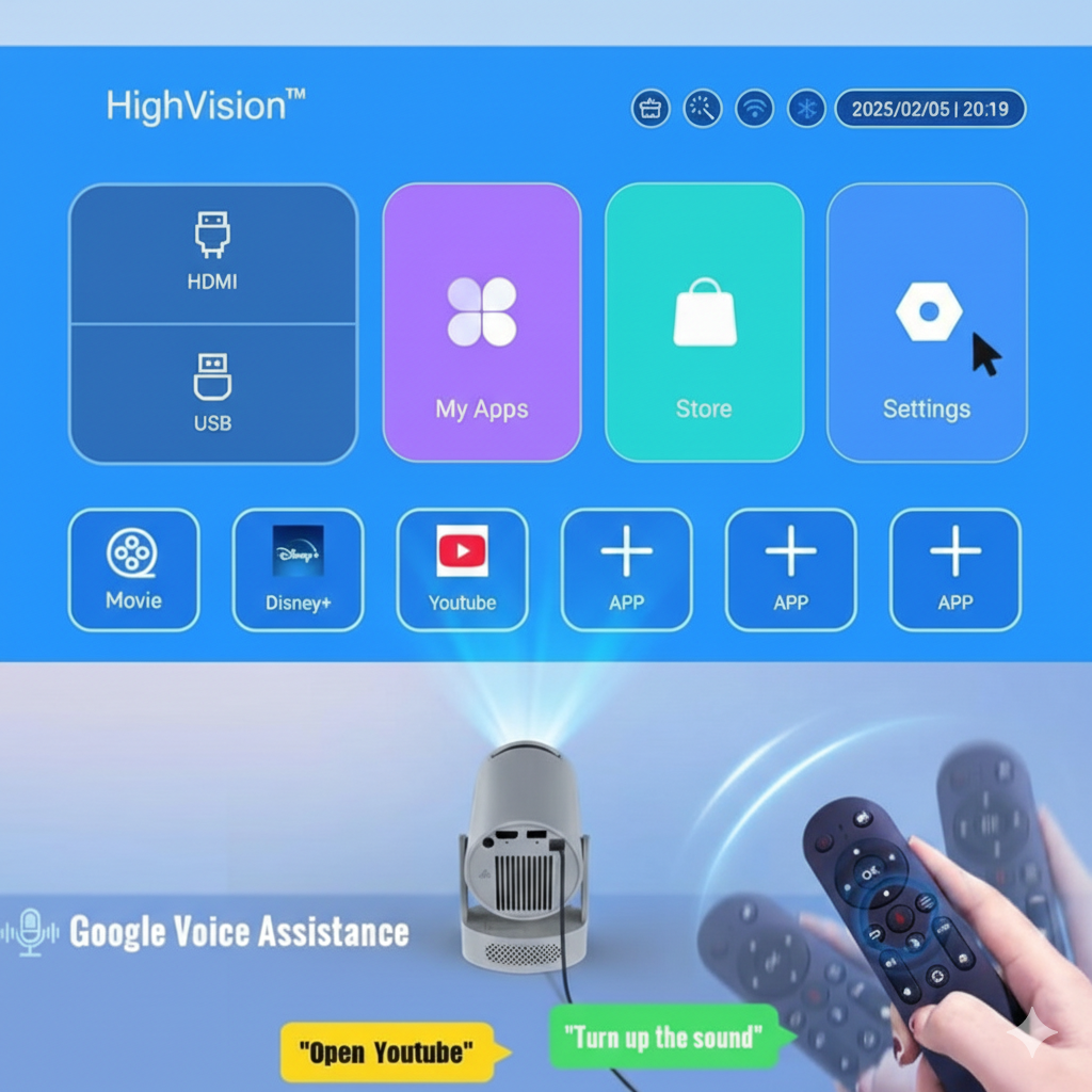 Projektörümüzün Android 11 işletim sistemi sayesinde Netflix, Prime Video, YouTube ve diğer tüm yayın platformlarını kolayca izleyebilir ve uygulamalarını yükleyebilirsiniz.